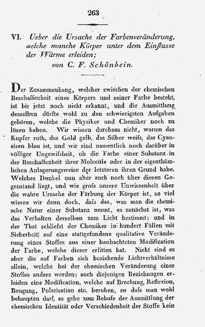 | 1838 | Schönbein | Ueber die Ursache der Farbenveränderung, welche manche Körper unter dem Einflusse der Wärme erleiden | Annalen der Physik und Chemie 121 (2-45) | 263 264 265 266 267 268 269 270 271 272 273 274 275 276 277 278 279 280 281 |