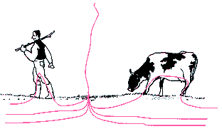 | Auch wenn der Blitz nicht direkt in eine Person einschlägt, kommt es in der Nähe des Einschlagpunktes zu gefährlich hohen Spannungen entlang des Erdbodens, die zu elektrischen Schlägen führen können. Die sicherste Stellung bei einem Gewitter ist daher, sich eng auf den Boden zu hocken, um einerseits keine Erhebung für den Blitzeinschlag zu bilden und andererseits keinen Strompfad für Blitzströme im Erdreich zu bilden. | ![]() |