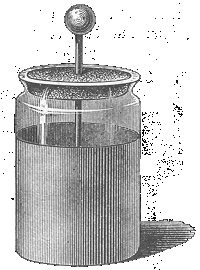 | Diese Flasche besteht aus einem oben offenen zylindrischen Nichtleiter (ein Glasgefäß) und trägt auf seiner Innen- und Außenfläche gegeneinander isoliert zwei leitende Schichten (aufgeklebtes Stanniol). Die innere Schicht ist zum bequemeren Aufladen der "Flasche" mit einer Metallstange verbunden, die nach außen ragt. | ![]() |
