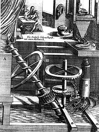 Eine Skizze von Leonardo da Vinci: Ein Spiralenrad und eine archimedische Schraube sind miteinander gekoppelt.