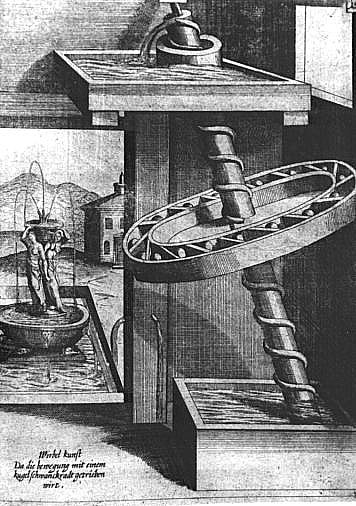 Denis Papin mit einem hydraulischen Perpetuum mobile aus dem Jahr 1685. Das Gewicht der größeren Flüssigkeitsmenge in einem breiten Gefäß sollte das Gewicht der Flüssigkeitssäule in dem engeren Rohr überwinden.