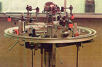 | Eine Eisenkugel mit einem Durchmesser von gut 6.5 cm rollt im Kreis auf einer Aluminiumschiene mit einem Durchmesser von gut 60 cm. Die Kugel wird durch drei beweglich aufgehangene Hufeisenmagneten in ewiger Bewegung gehalten. Die Magneten werden, durch drei in die Laufschiene integrierte Metallbügel, welche von der Stahlkugel überrollt werden, in eine Schwenkbewegung versetzt. | |