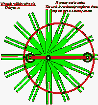 | Das älteste überlieferte Perpetuum mobile ist ca. 1150 durch den indischen Dichter, Mathematiker und Astronomen Bhãskarã beschrieben. Es handelt sich um ein Rad mit langen Gefäßen, in denen sich Quecksilber befindet. Dank der verschieden weit entfernten Gewichte soll es sich ewig drehen können. | ![]() |