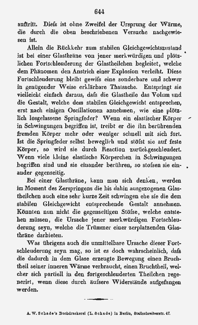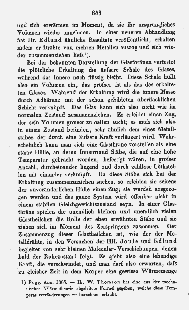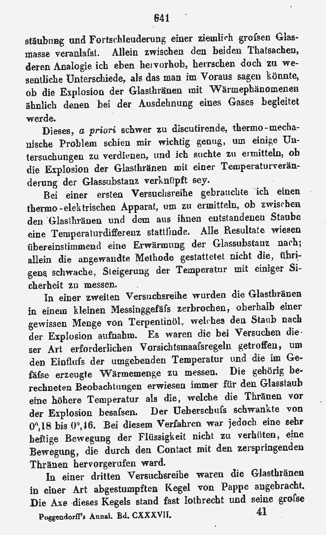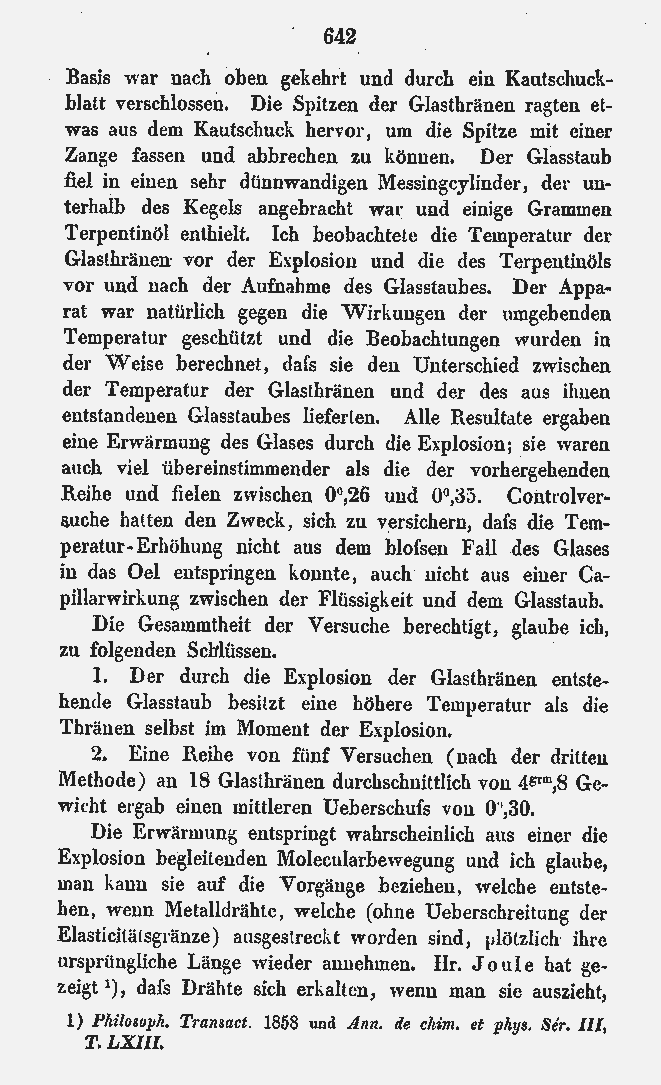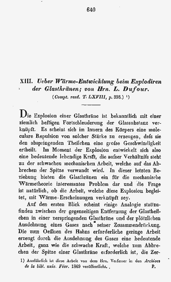 1869 Dufour Ueber Wärme-Entwicklung beim Explodiren der Glasthränen Annalen der Chemie und Physik 213 (2-137) 640 641 642 643 644
