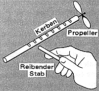 Ein uraltes, einfaches Holzspielzeug ist ein Stab mit Propeller und Kerben. Reibt man mit einem Hölzchen über die Kerben, so dreht sich der Propeller. Durch lautes Aussprechen des Wortes "hhhhuuuuiiiiiiii" bremst der Propeller und dreht sich dann in die andere Richtung... |
