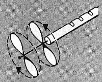 Durch die Asymmetrie der Dämpfung, die durch die Handhaltung entsteht, sind diese Bewegungen elliptisch (Lissajous-Figur), wobei der Umlaufsinn von der Haltung abhängt. Das führt über die Reibung zu den Rotationen des Propellers, rechts- bzw. linksherum. |