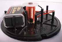 | Der Aufbau ist recht einfach. Der Kreisel ist im wesentlichen eine magnetische Scheibe, wie sie an magnetischen Pinwänden zu finden ist. Der Unterbau ist eine kleine elektrische Schaltung, wie nebenstehend. Die Spule besteht aus 7000 Windungen (0,1 mm Kupferdraht) oder ist eine Relaisspule mit Mittelanzapfung. | ![]() |