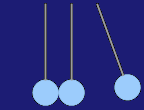 | Lenkt man eine Kugel ein wenig aus und lässt sie los, schlägt sie auf die verbleibende Kugelreihe auf und die Kugel auf der anderen Seite wird weg geschleudert. Die verbleibende Kugelreihe bleibt in Ruhe und der Vorgang wiederholt sich in der anderen Richtung. | Lenkt man 2 Kugeln aus, werden die beiden Kugeln der anderen Seite weg geschleudert usw. Es macht den Eindruck, als ob die jeweils gegenüberliegenden Kugeln die Rolle der ursprünglichen übernehmen und die restlichen Kugeln unbeteiligt und ruhig hängenbleiben. | |