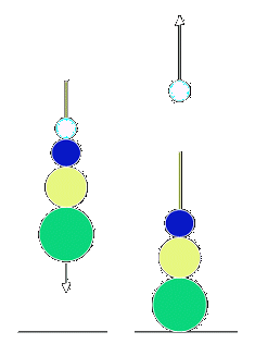 Vier lose elastische Kugeln sind auf eine Stange gefädelt. Hält man den Astro-Blaster an der Spitze der Stange fest und lässt ihn dann zu Boden fallen, wird beim Aufprall nur die oberste Kugel in eine überraschende Höhe reflektiert. Die anderen Kugeln bleiben ruhig liegen. Dabei sollte man allerdings beten, dass der Astro-Blaster möglichst senkrecht auf den Boden trifft. |