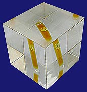 Ein durchsichtiges Röhrchen, gefüllt mit einer zähen Flüssigkeit und ein wenig Luft, eingebettet in Acrylglas. Die unterschiedlichen Steigungswinkel (je nach Lage des Würfels) sorgen für ein verschieden schnelles Aufsteigen der Luftblase. |