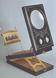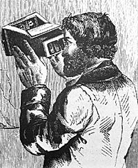 1838 entwickelte der englische Physiker Sir Charles Wheatstone ein Gerät namens "Stereoskop", das beiden Augen zwei verschiedene Bilder zum Betrachten gab. Es funktioniert mit zwei winklig angebrachten Spiegeln (A), in denen beim "Geradeaussehen" die Halbbilder zu einem Raumbild zusammengeführt werden können.