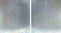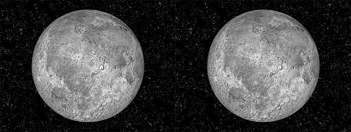 Hier ein Stereogramm des Mondes, dessen kugelförmige Gestalt zu erkennen ist. Da die Stereobasis bei einer Aufnahme des Mondes etwa 13000 km beträgt, und da man derart große Fotoapparate nicht bauen kann, wurden beide Halbbilder im zeitlichen Abstand von 30 Minuten aufgenommen (die Erde dreht sich derweil um den notwendigen Abstand).