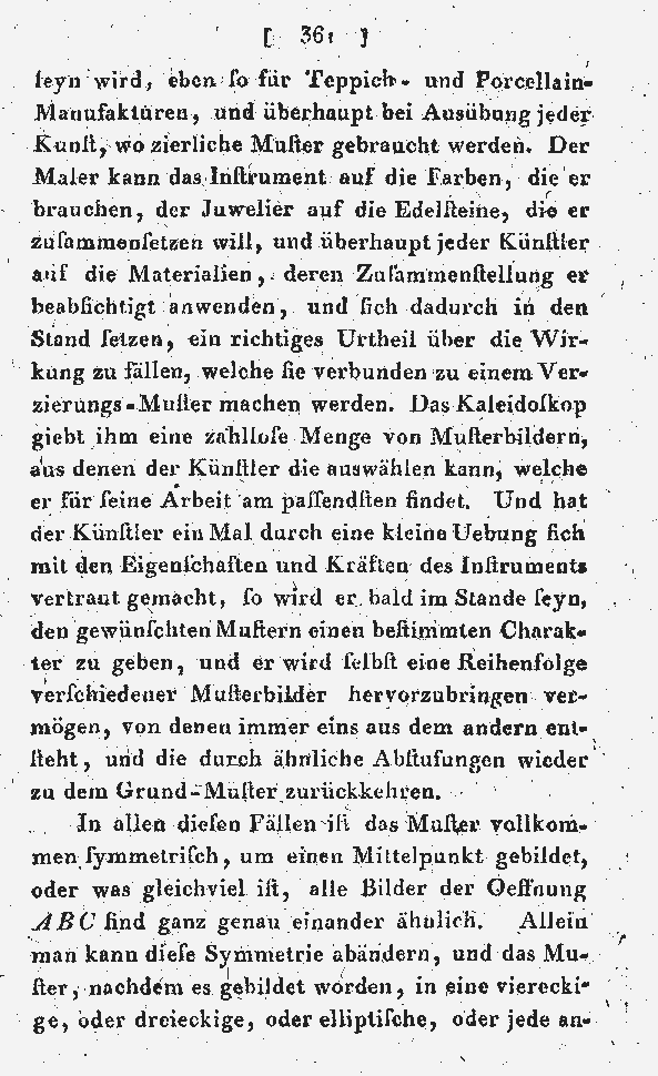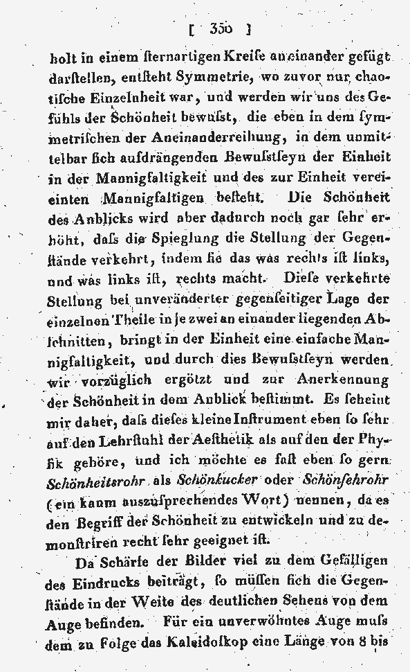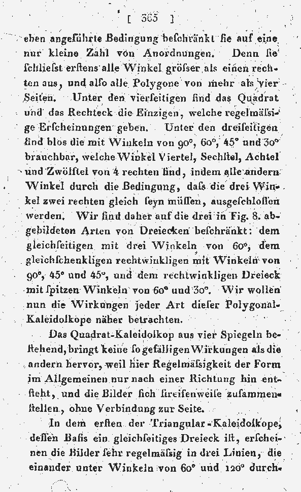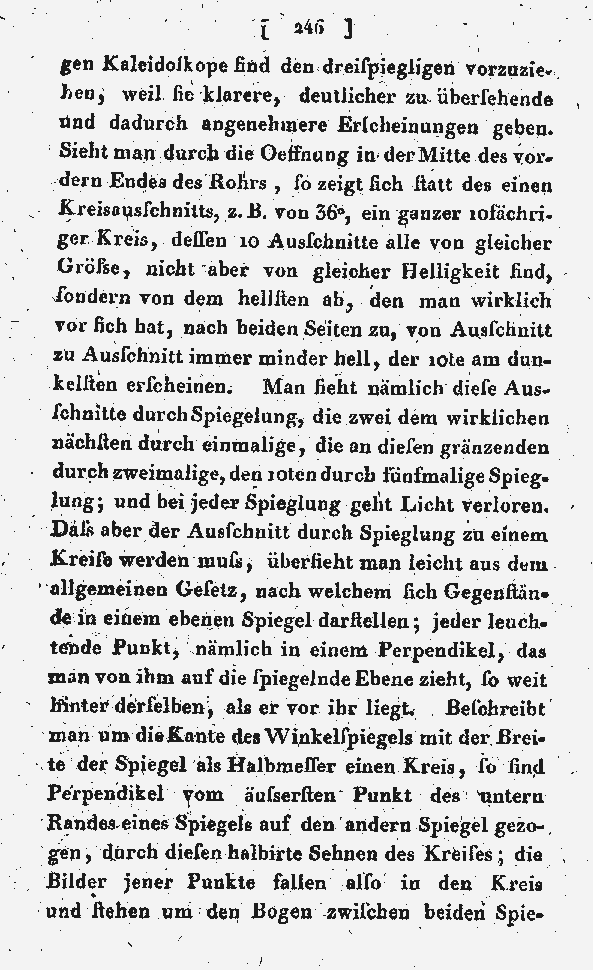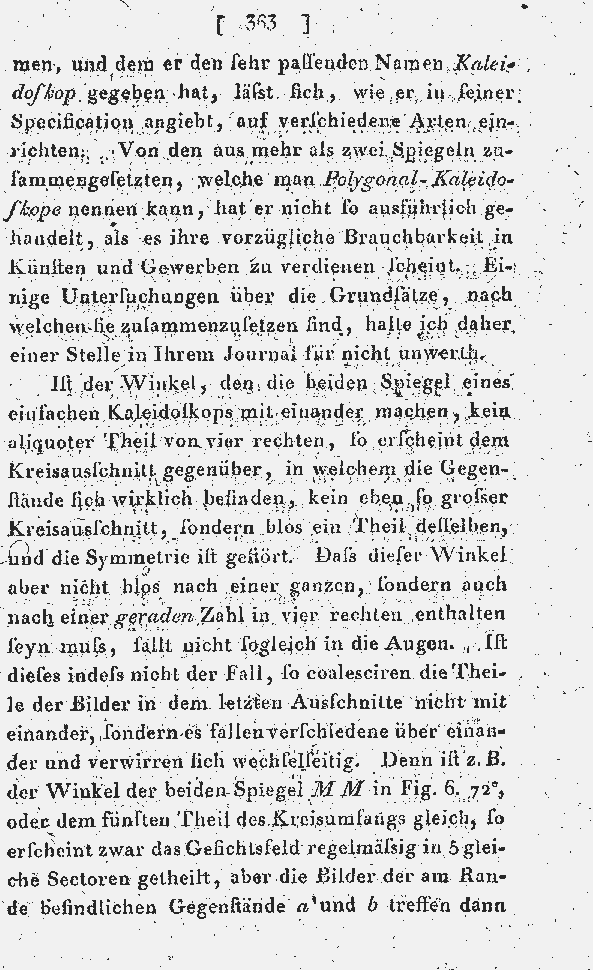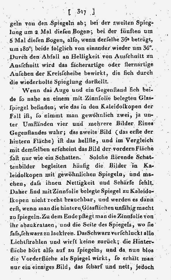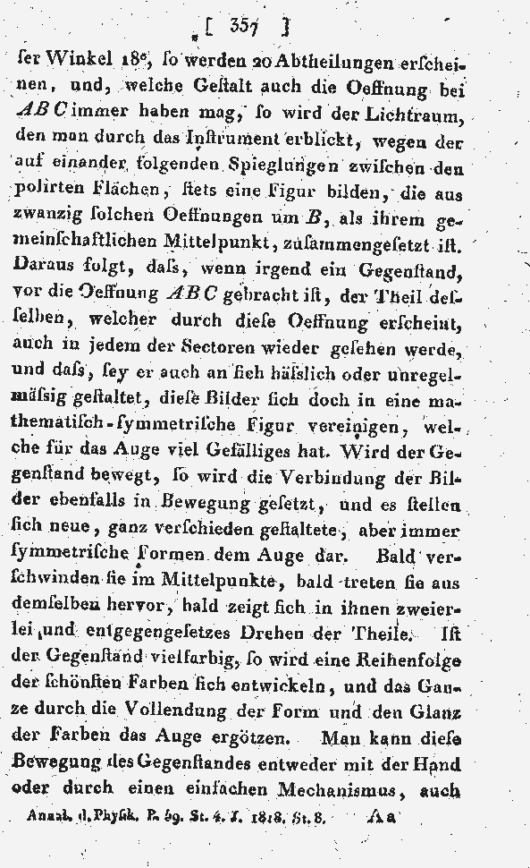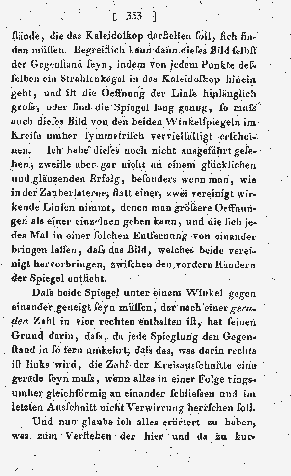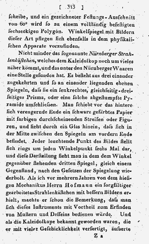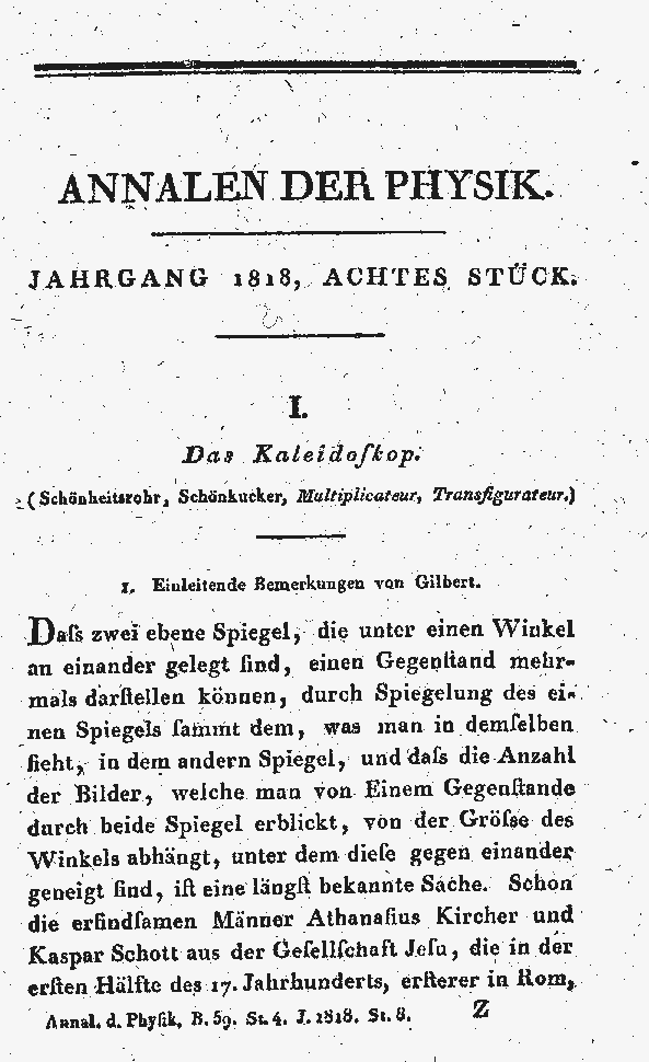 | Das Kaleidoskop ist wohl allen bekannt. Drei Spiegel, die einen dreieckigen Kanal formen, und ein paar bunte Glasscherben am einen Ende zaubern, durchgeschaut, die phantastischsten Formen und Farben. Aus den Annalen der Physik, Band 59, Anno 1818: "Das Kaleidoskop. (Schönheitsrohr, Schönkucker, Multiplicateur, Transfigurateur)" |