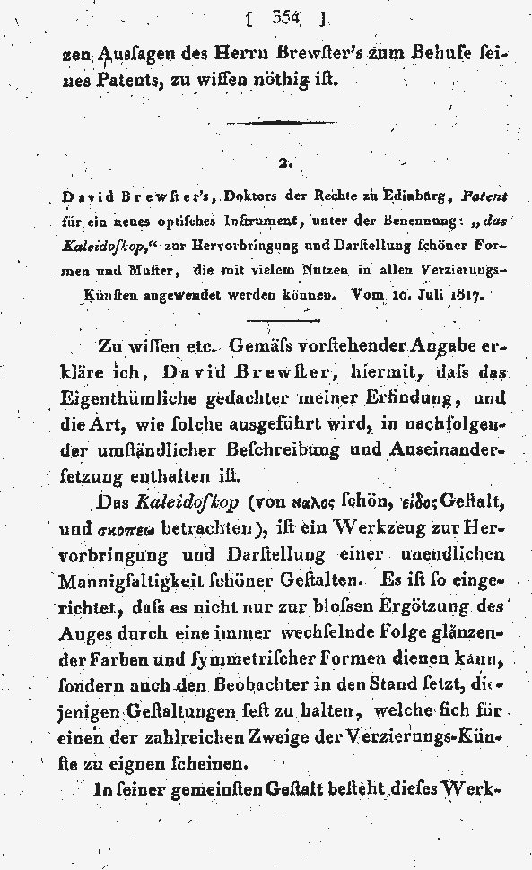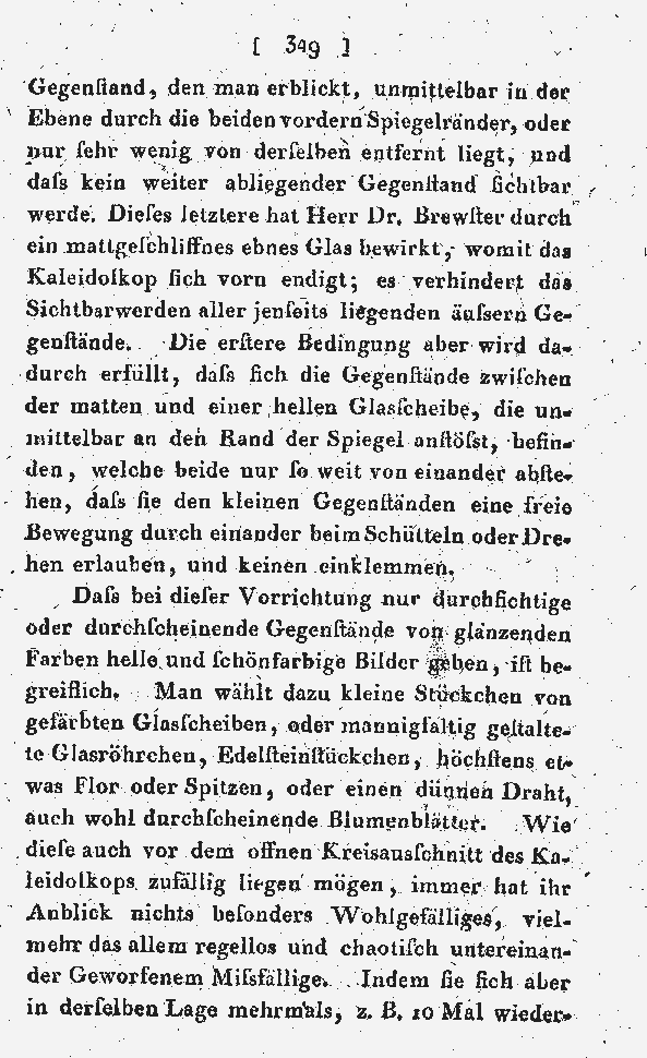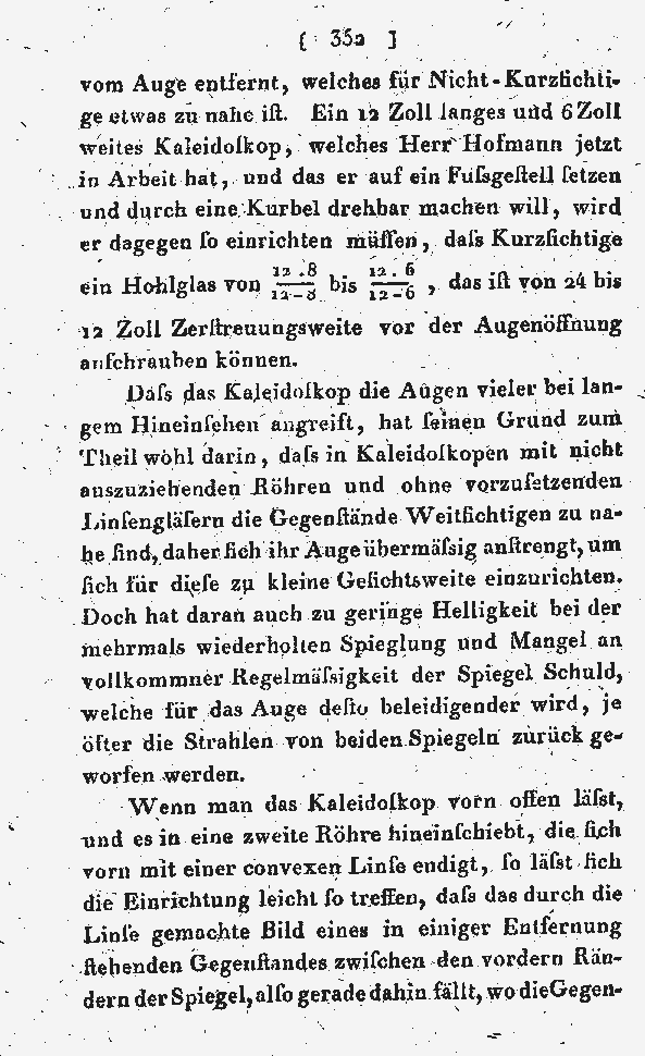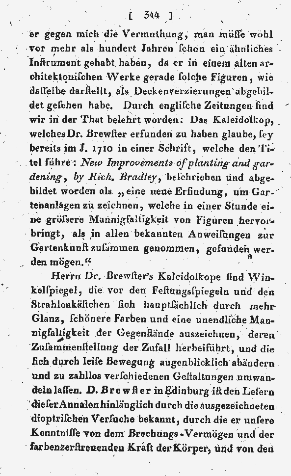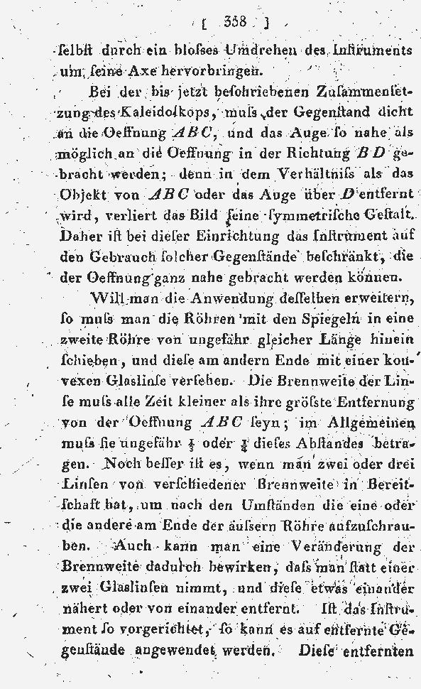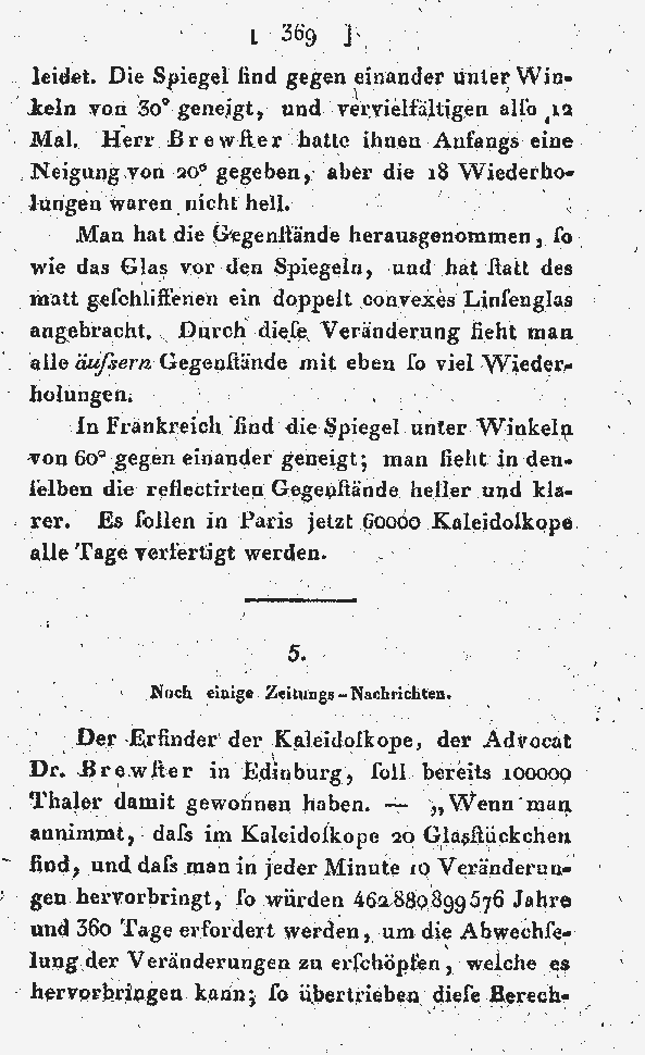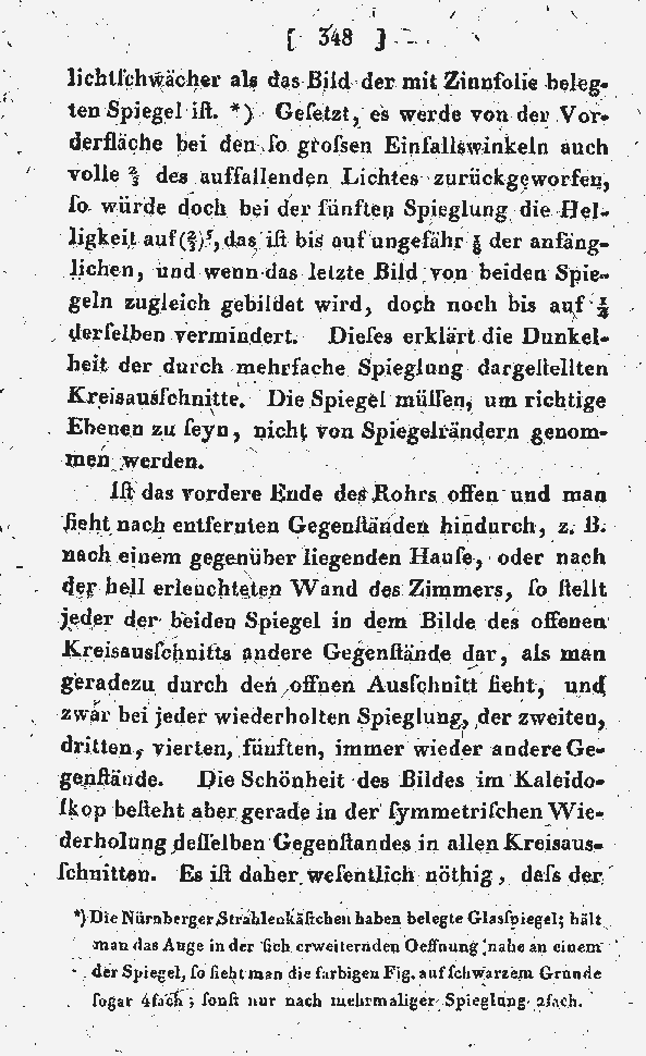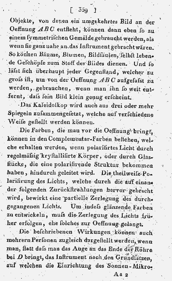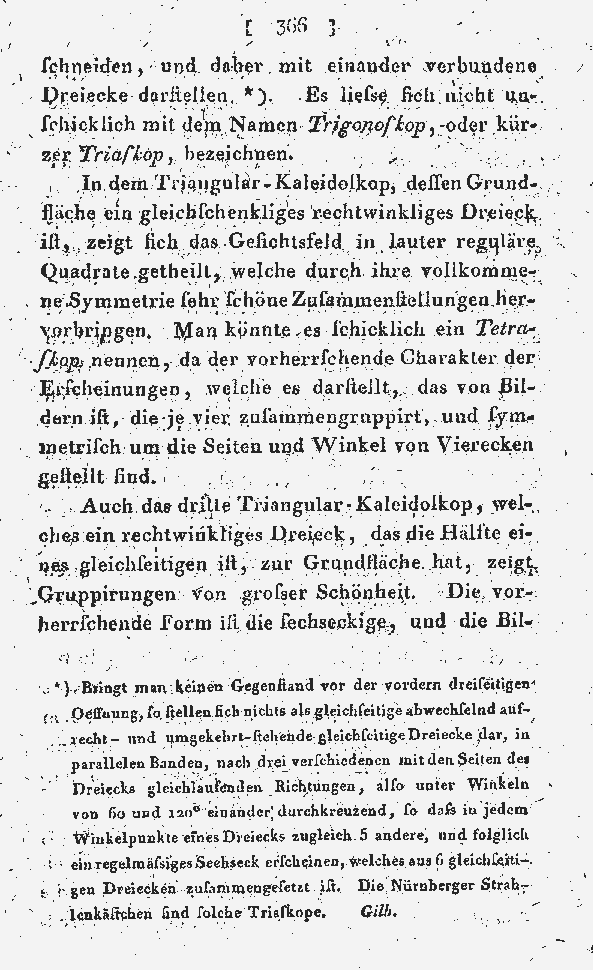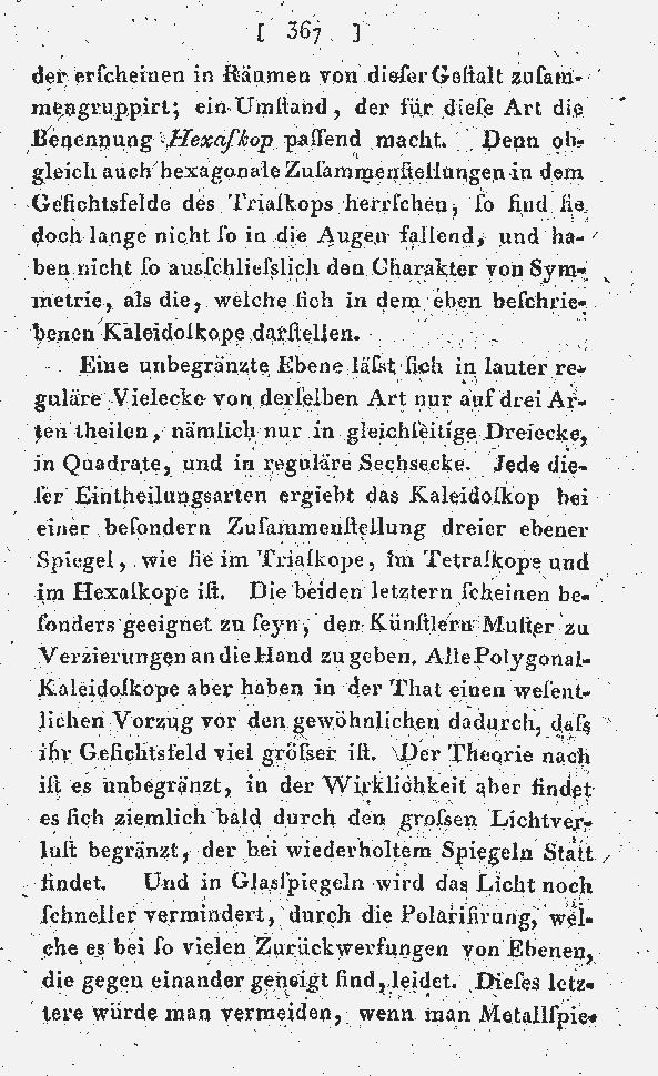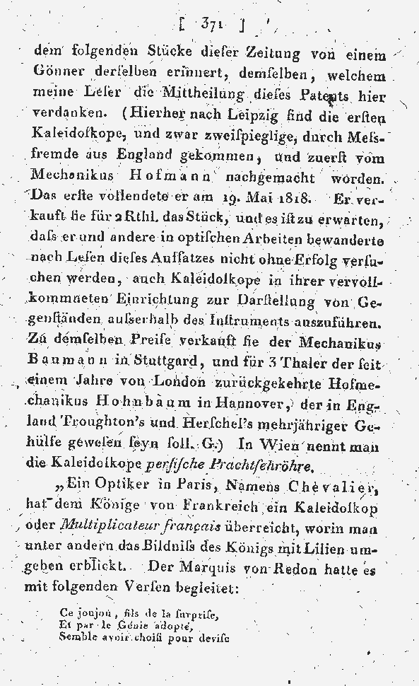| Das Kaleidoskop ist wohl allen bekannt. Drei Spiegel, die einen dreieckigen Kanal formen, und ein paar bunte Glasscherben am einen Ende zaubern, durchgeschaut, die phantastischsten Formen und Farben. Aus den Annalen der Physik, Band 59, Anno 1818: "Das Kaleidoskop. (Schönheitsrohr, Schönkucker, Multiplicateur, Transfigurateur)" |