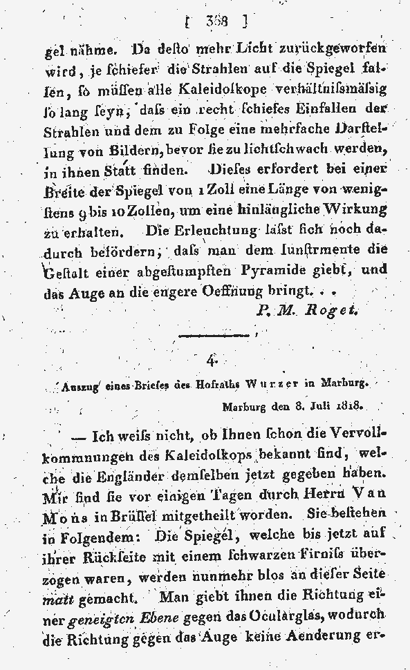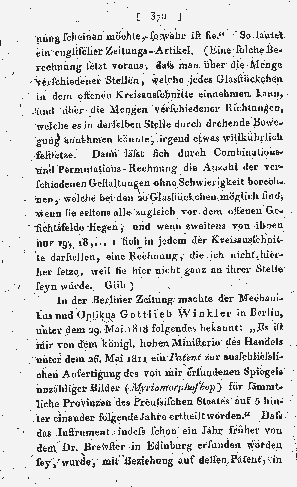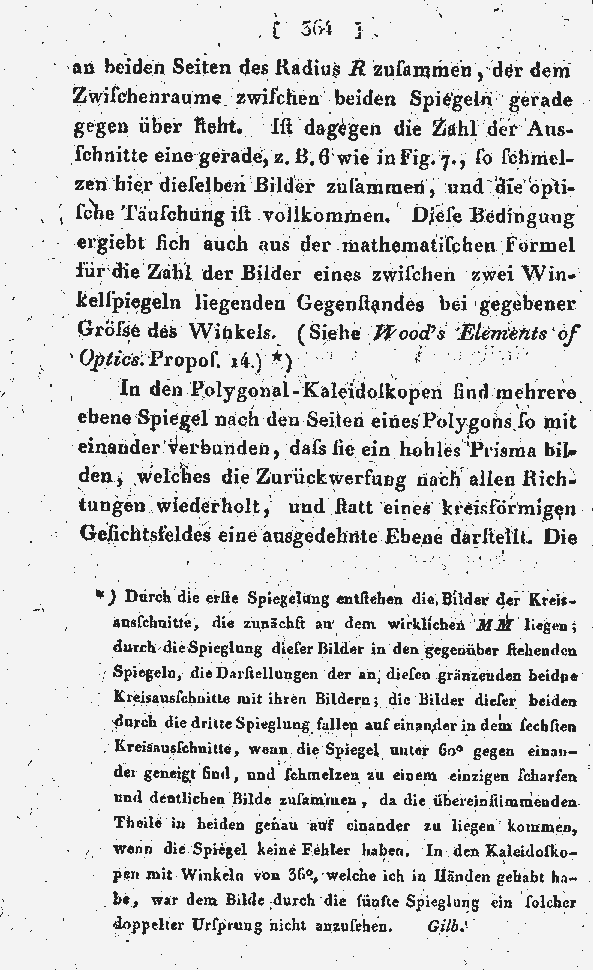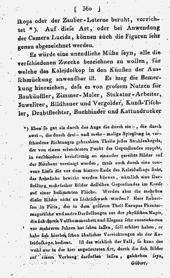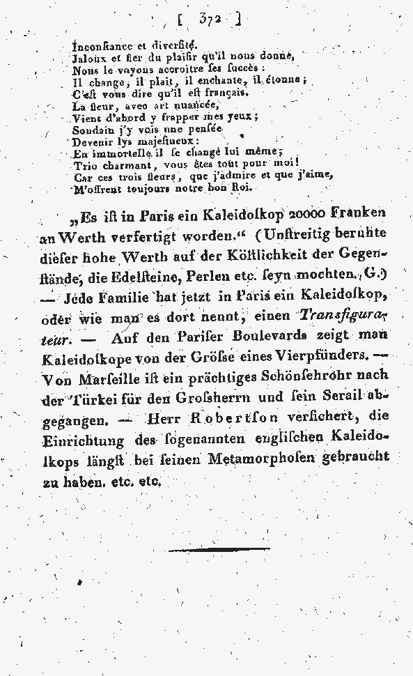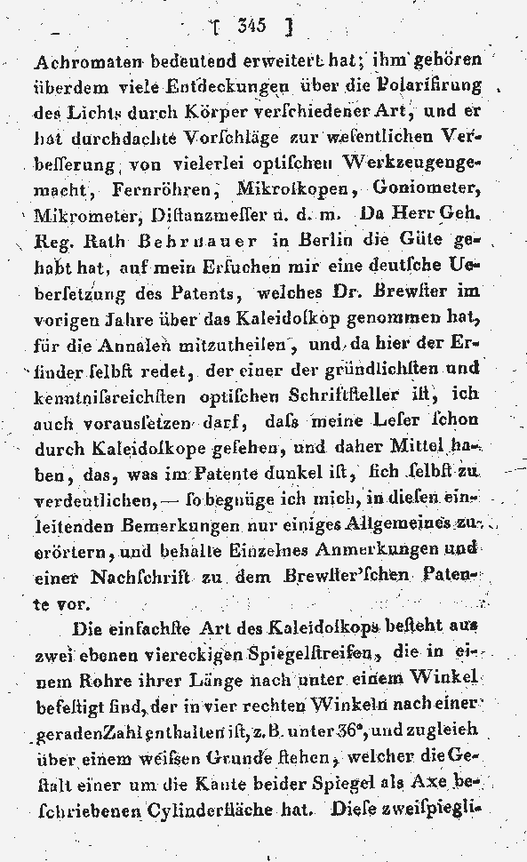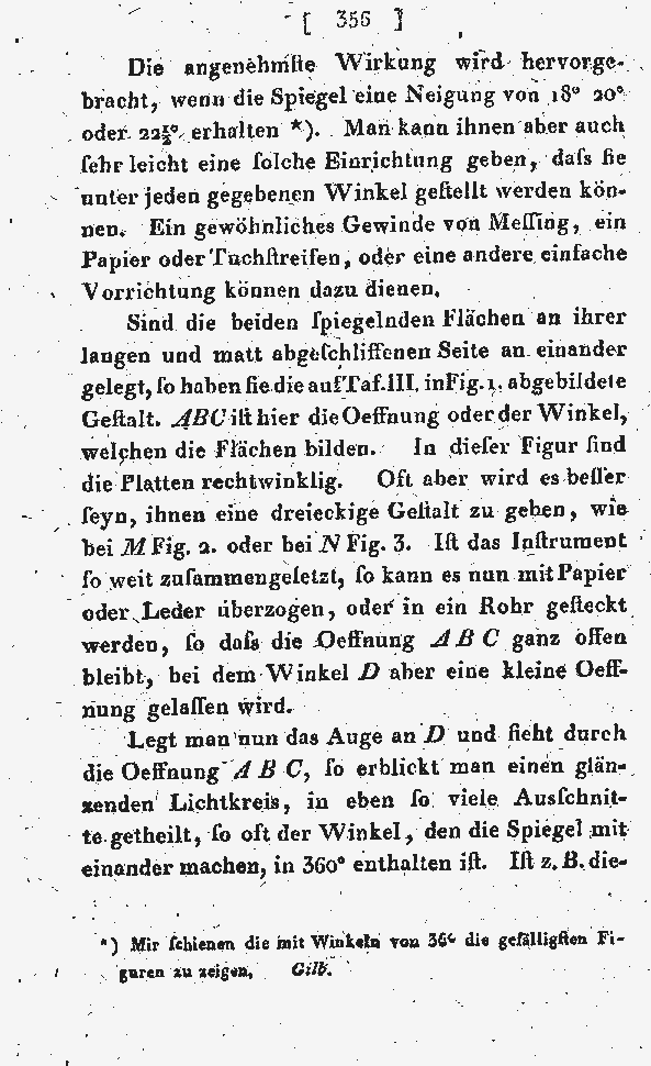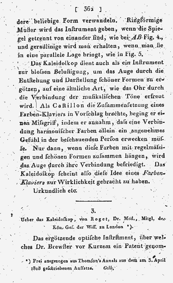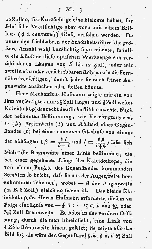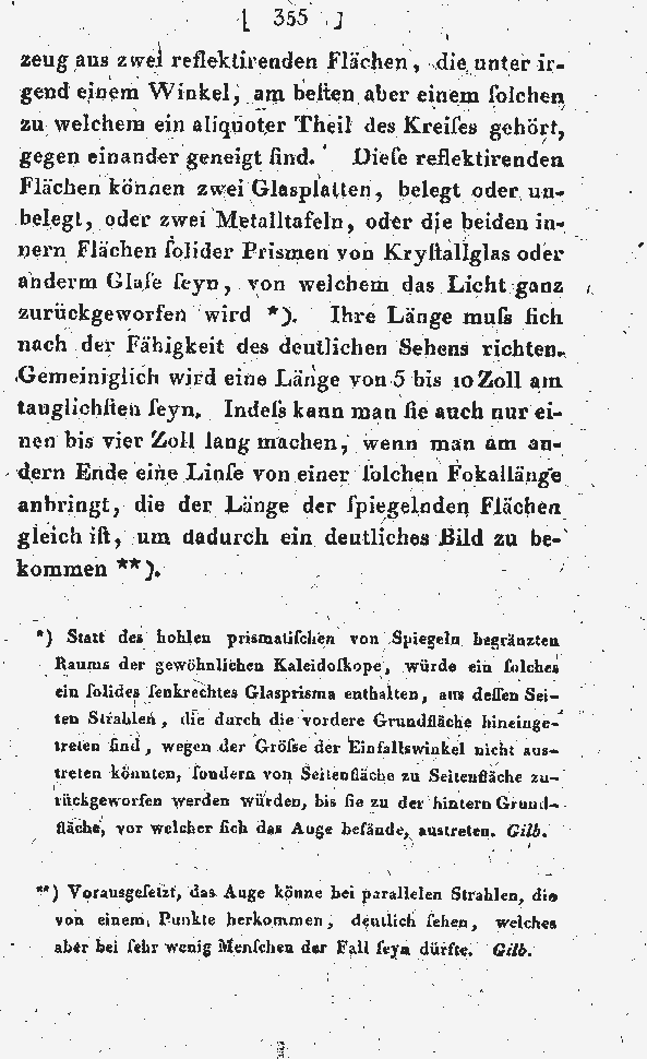 | Das Kaleidoskop ist wohl allen bekannt. Drei Spiegel, die einen dreieckigen Kanal formen, und ein paar bunte Glasscherben am einen Ende zaubern, durchgeschaut, die phantastischsten Formen und Farben. Aus den Annalen der Physik, Band 59, Anno 1818: "Das Kaleidoskop. (Schönheitsrohr, Schönkucker, Multiplicateur, Transfigurateur)" |