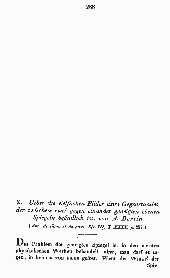 | 1851 | Bertin | Ueber die vielfachen Bilder eines Gegenstandes, der zwischen zwei gegen einander geneigten ebenen Spiegeln befindlich ist | Annalen der Physik und Chemie 158 (2-82) | 288 289 290 291 292 293 294 Bild |