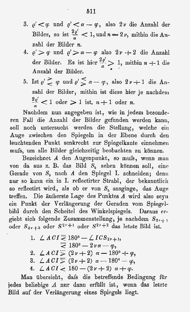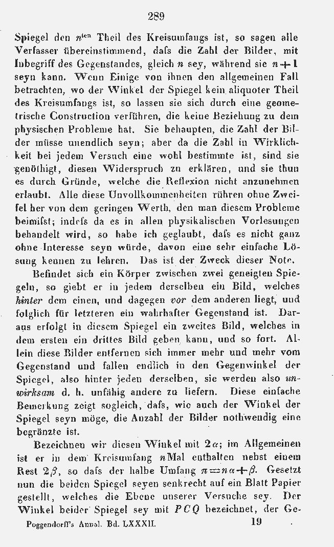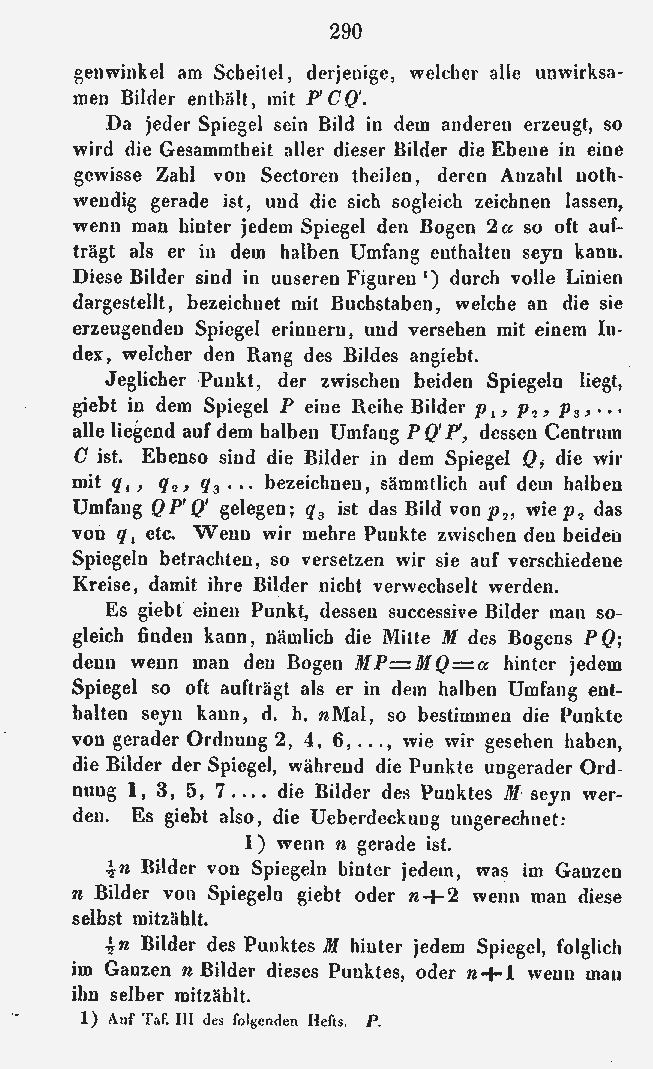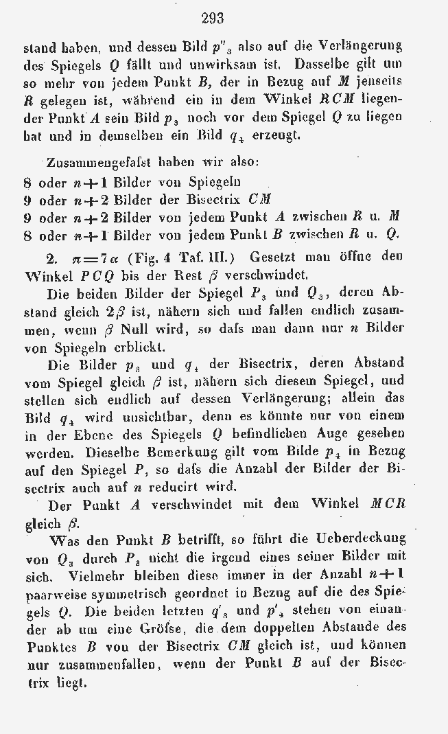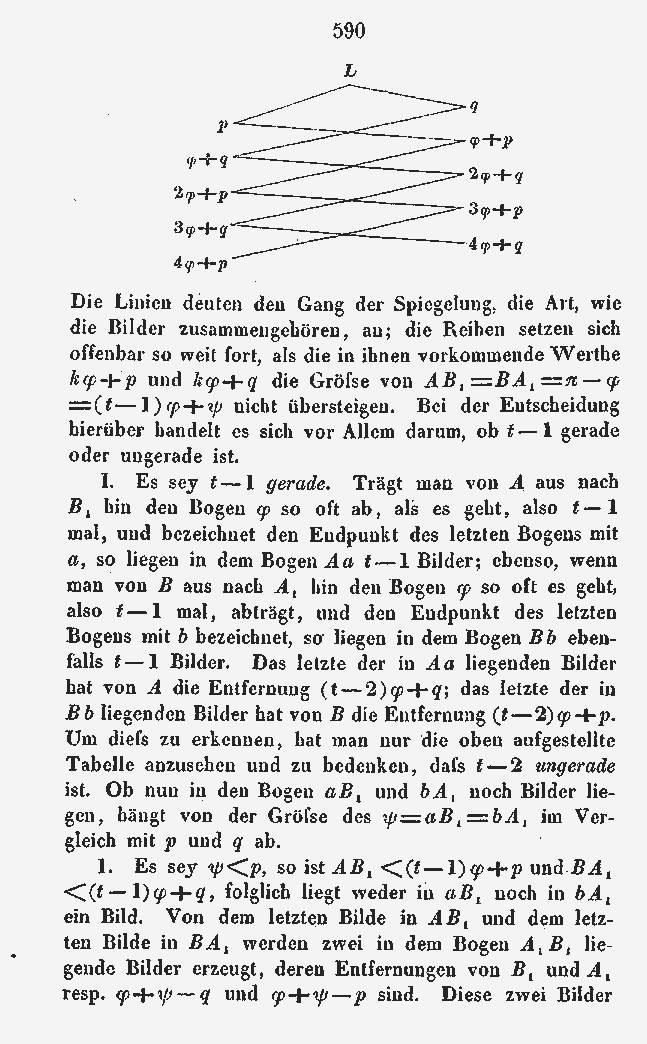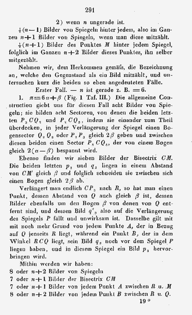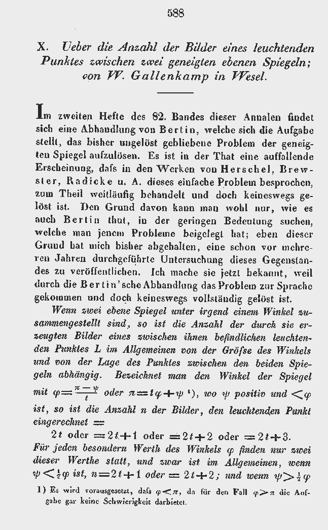 | 1851 | Gallenkamp | Ueber die Anzahl der Bilder eines leuchtenden Punktes zwischen zwei geneigten ebenen Spiegeln | Annalen der Physik und Chemie 158 (2-82) | 588 589 590 591 592 593 Bild |