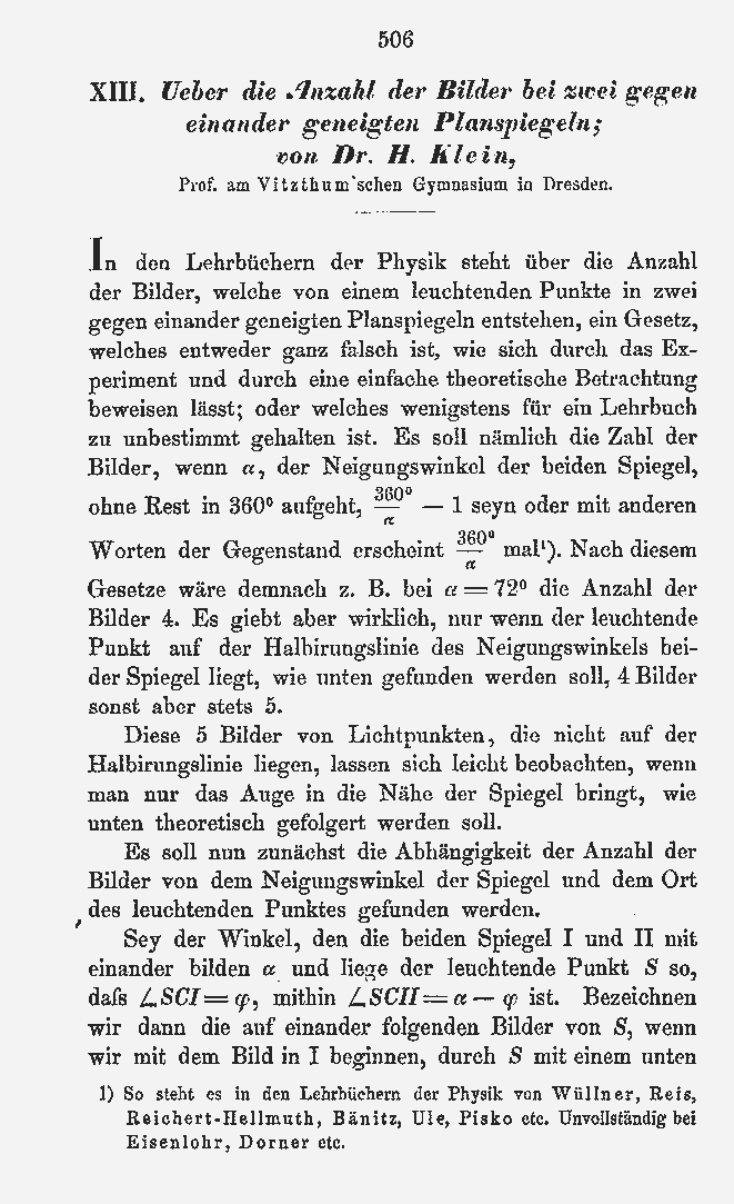 | 1874 | Klein | Ueber die Anzahl der Bilder bei zwei gegen einander geneigten Planspiegeln | Annalen der Physik und Chemie 228 (2-152) | 506 507 508 509 510 511 512 |