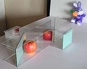 Eine Schachtel mit drei Spiegeln kann ganz eigentümliche Durchsichten ermöglichen. Gedrehte Spiegel verdoppeln den Drehwinkel ihres Spiegelbildes. |