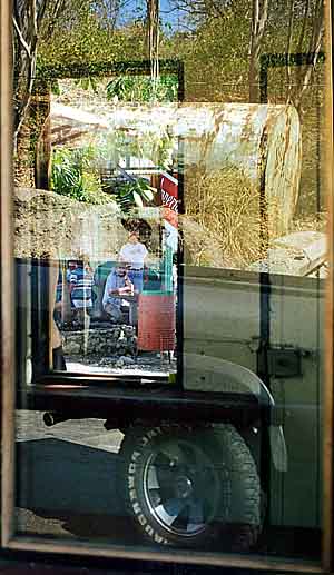 | Nebenstehend ein besonders verwirrendes Foto, dass völlig ohne Tricks entstanden ist. Ein Tipp zum Entwirren: Die Sicht geht durch eine (reflektierende) Fensterglasscheibe in ein Zimmer mit einem gegenüberliegendem Fenster. Frage: Wo befindet sich der Laster (mit einem zylindrischen Tank?) und die Personen? Vor, in oder hinter dem Zimmer? |