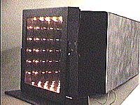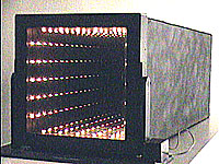 Eine einzelne quadratische Reihe vom Lämpchen vor einem Spiegel und hinter einem halbdurchlässigen Spiegel erzeugen die Illusion der Tiefe.