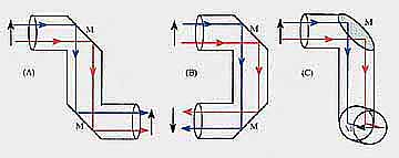 Ein Periskop mit der Möglichkeit, seine beiden Enden zu verdrehen, sorgt für Überraschungen: (A) zeigt alles aufrecht, (B) alles umgedreht und (C) alles auf der Seite liegend. |