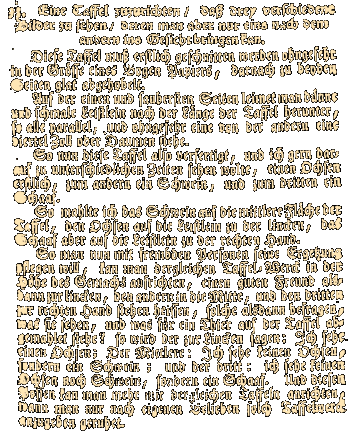 Eine andere Art, verschiedene Bilder aus verschiedenen Blickwinkeln zu sehen, ist durch senkrecht angeordnete Bildstreifen möglich.![]() Allerdings können nur drei verschiedene Motive gezeigt werden, außerdem muss die Höhe und der Abstand der Streifen in Relation zum Betrachtungsabstand und -winkel stehen. Rechts ein Text aus "Natürliches Zauber=Buch" des Jahres 1745. |