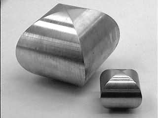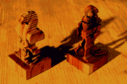 Etwas raffinierter sind Skulpturen mit zwei verschiedenen Umrissen. Entsprechend beleuchtet zeigen ihre Schatten zwei mehr oder minder künstlerische Motive. In der "falschen" Richtung betrachtet zeigen sich sehr unregelmäßige Formen.