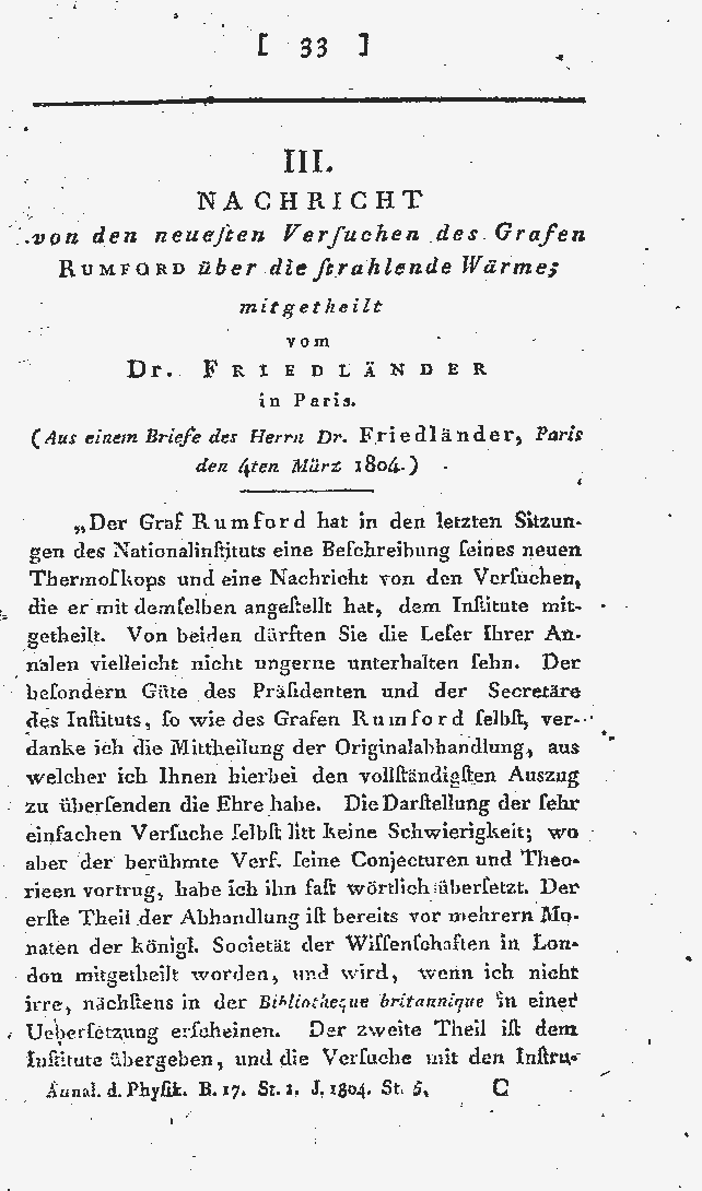 1804 Rumford & Friedländer Nachricht von den neuesten Versuchen des Grafen Rumford über die strahlende Wärme Annalen der Physik 17 33 34 35 36 37 38 39 40 41 42 43