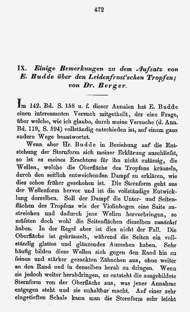 1872 Berger Einige Bemerkungen zu dem Aufsatz von E. Budde über den Leidenfrost'schen Tropfen Annalen der Physik und Chemie 223 (2-147) 472 473 474
