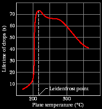 Genauere Messungen ergeben eine "Tropfenlebensdauer" in Abhängigkeit der Temperatur, wie sie nebenstehend zu sehen ist. Unterhalb einer bestimmten Temperatur (dem Leidenfrost-Punkt) sieden die Tropfen rasch und verdampfen brodelnd, und ab dem Leidenfrost-Punkt vergehen sie langsam, geheimnisvoll und still.