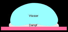 Wärme der heißen Unterlage überträgt sich in die aufliegende Wasserschicht des Tropfens und breitet sich dann im Tropfen weiter aus, was aber eine gewisse Zeit benötigt. Ist die Unterlage deutlich heißer als der Siedepunkt des Tropfens, verdampft nur die untere Schicht des Tropfens, während der obere Teil noch recht kühl ist. Es bildet sich eine dünne Schicht aus Wasserdampf, die den Tropfen anhebt und wie eine Schutzschicht wirkt, denn Gase bzw. Dämpfe sind schlechte Wärmeleiter. Der Tropfen kann auf diesem Dampfkissen leicht hin- und hergleiten und widersteht dem "Tod durch Verdampfen" viele Sekunden.