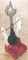 | Durch die Verdunstungswärme des feuchten Kopfes kühlt er ab (mit Alkohol geht es besser als mit Wasser) und es kondensiert etwas Dampf. Der entstehende Unterdruck zieht Flüssigkeit durch das unten eintauchende Röhrchen nach oben. Dadurch wandert der Schwerpunkt ebenfalls nach oben. | Es entsteht ein instabiles Gleichgewicht und die Ente kippt nach vorne (dank der speziellen Halterung nicht nach hinten). Die beiden bisher getrennten Dampfvolumina kommen nun zusammen, die Flüssigkeit fließt wieder zurück in den unteren Teil der Ente. Der Schwerpunkt wandert abwärts, die Ente richtet sich auf und das Spiel beginnt von neuem. |